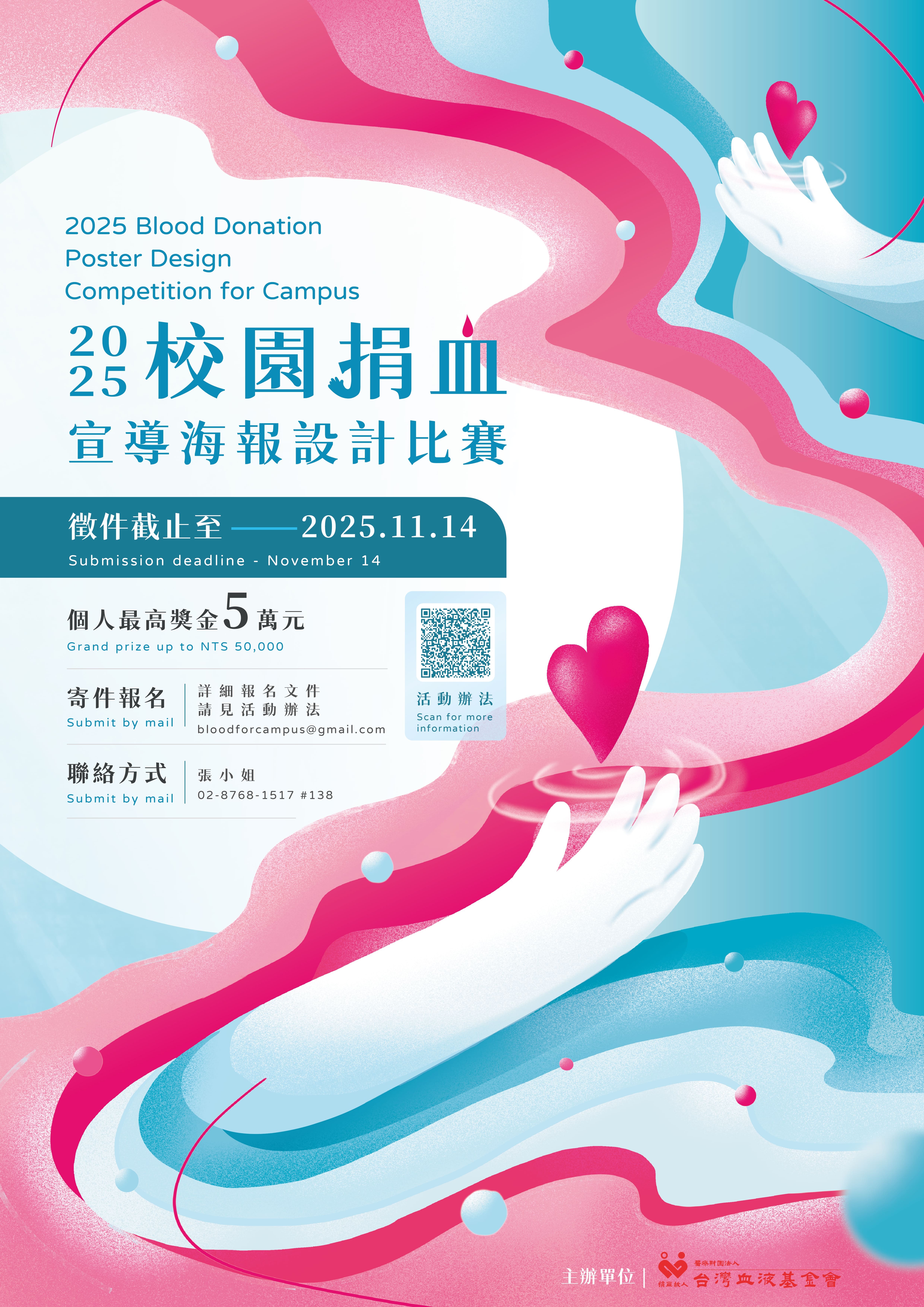 一、為鼓勵青年族群捐血、加強對自願無償捐血的認知並深化捐血救人觀念,本基金會辦理114年校園捐血海報設計比賽,