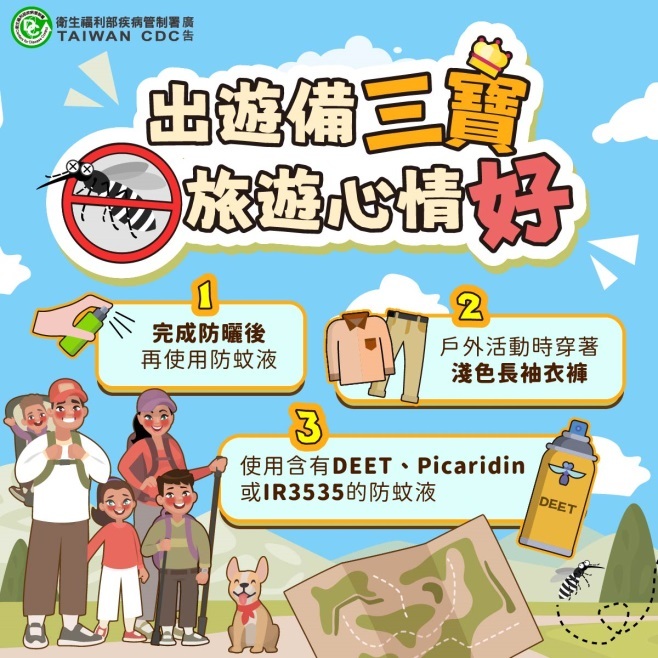 (二)寒假期間教職員工生至國外旅遊、探親等活動機會增加,爰請加強對其進行衛教宣導,包含:旅遊時做好防蚊措施、自流行國家返國後應自主健康監測14天,如出現發燒、頭痛、後眼窩痛、肌肉痛、關節痛及出疹等疑似症狀,應儘速就醫並主動告知旅遊史,以利醫師診斷及治療。